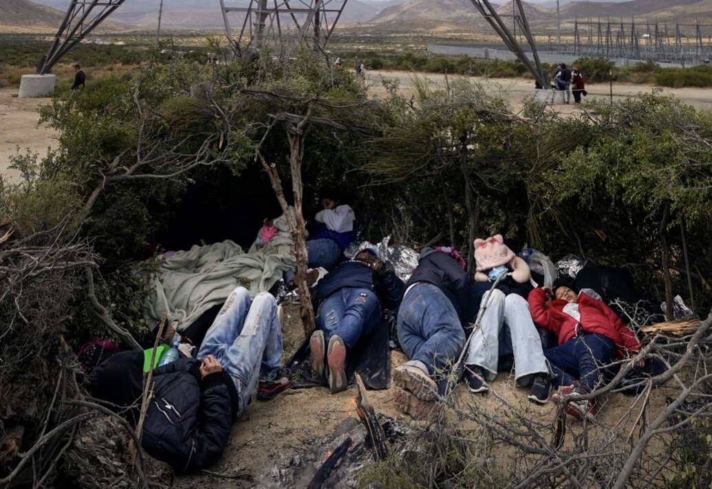 Nhóm người di cư nằm ngủ trong điểm nghỉ chân dựng bằng cành cây sau khi vào Mỹ hồi tháng 5/2023. Ảnh: AP