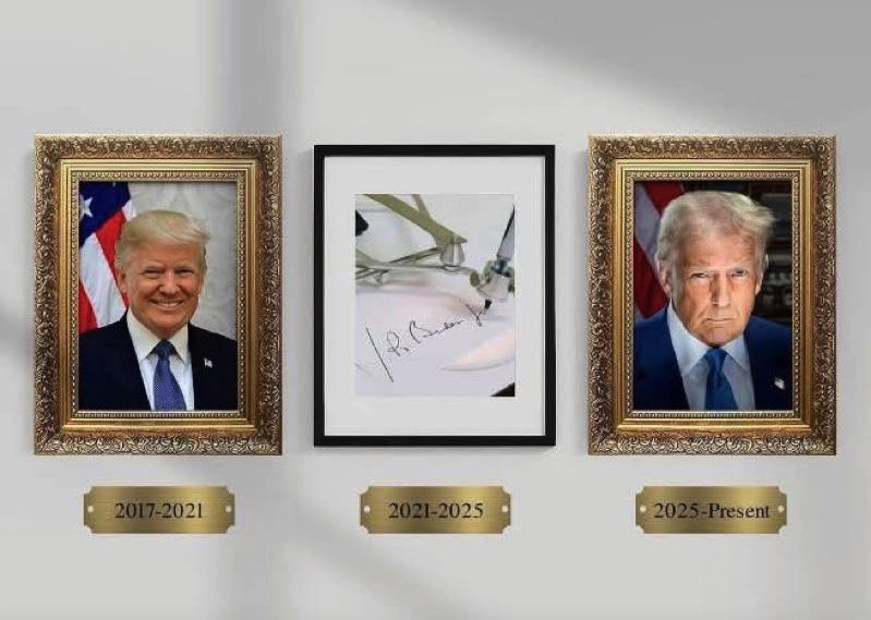 Một loại hình ảnh các đời Tổng thống Mỹ treo trên tường tại phòng bầu dục, Tòa bạch ốc. Đương kim Tổng Thống Hoa Kỳ Donald Trump đã bỏ ảnh ông TT Joe Biden, thay bằng một hình ảnh cây bút ký tự động.