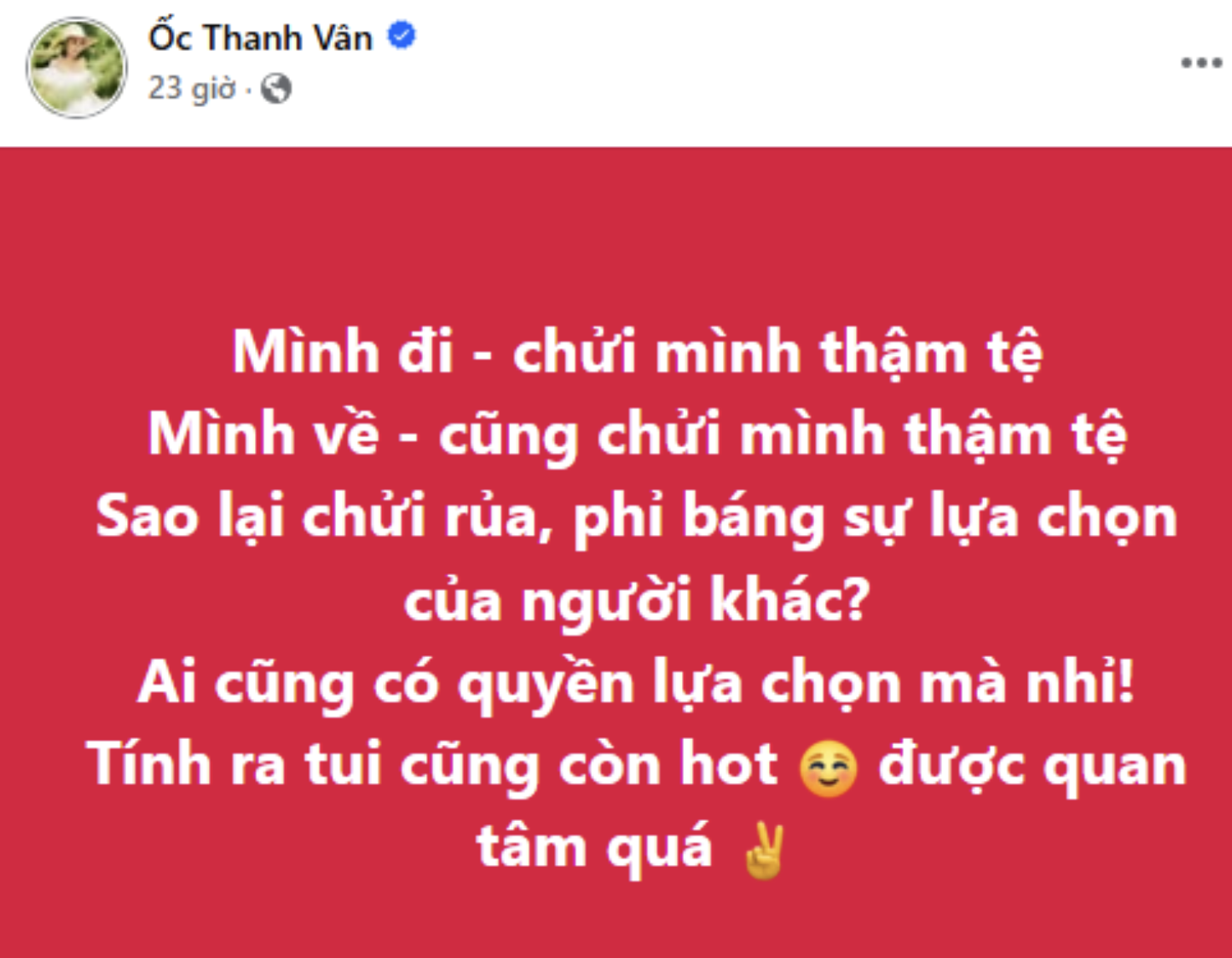 Mới đây, cô gây chú ý khi viết dòng trạng thái tỏ thái độ bức xúc trên trang cá nhân. Ốc Thanh Vân cho biết việc quyết định sang Úc định cư và trở về Việt Nam đã nhận về những ý kiến trái chiều trong suốt thời gian qua. Cô nêu quan điểm: "Mình đi - chửi mình thậm tệ. Mình về - cũng chửi mình thậm tệ. Sao lại chửi rủa, phỉ báng sự lựa chọn của người khác. Ai cũng có quyền lựa chọn mà nhỉ. Tính ra tôi cũng còn hot, được quan tâm quá".