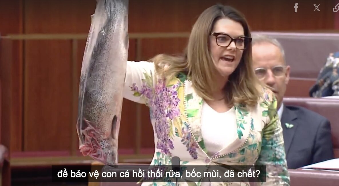 "Có phải các vị đã đánh đổi cam kết bảo vệ môi trường của mình để bảo vệ con cá hồi thối rữa, bốc mùi này ngay trước thềm bầu cử không?", bà Hanson-Young vừa giơ con cá chết vừa chất vấn Thượng nghị sĩ Công đảng Jenny McAllister, đại diện Bộ trưởng Môi trường.