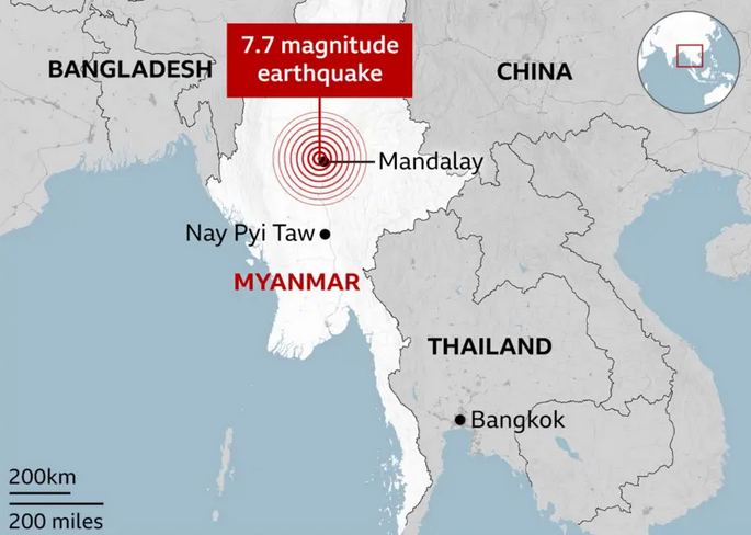 Cơn địa chấn 7.7 độ Richter có tâm chấn gần Mandalay tại Miến Điện, xảy ra vào buổi trưa, kế đến là một trận dư chấn mạnh 6.4 độ Richter xảy ra sau đó.