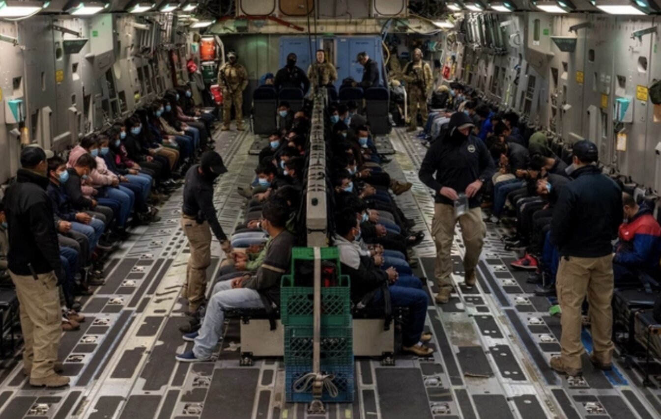 Những người nhập cư đang chờ cất cánh trên chuyến bay trục xuất tại Sân bay quốc tế Tucson, Arizona, ngày 23-1-2025 - Ảnh: www.defense.gov