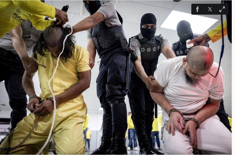 Cảnh sát El Salvador ngày 16/3 cạo đầu những người bị cáo buộc là thành viên băng đảng bị Mỹ trục xuất. Ảnh: Reuters