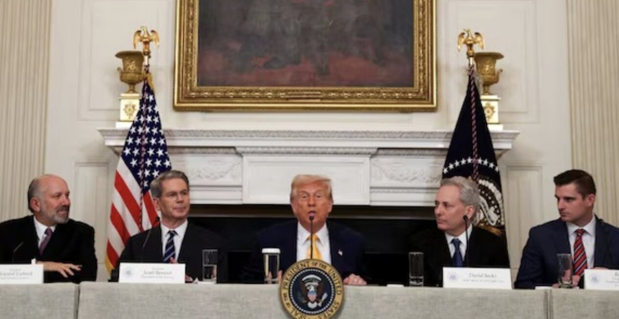 Tổng thống Trump cùng ông trùm tiền điện tử David Sacks, Bộ trưởng Tài chính Scott Bessent, Bộ trưởng Thương mại Howard Lutnick và Giám đốc điều hành Hội đồng cố vấn của Tổng thống về Tài sản kỹ thuật số Bo Hines tại Hội nghị ở Washington, Mỹ ngày 7/3. Ảnh: Reuters