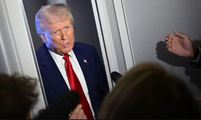 Tổng thống Donald Trump trao đổi với phóng viên tháp tùng ông trên chuyên cơ Air Force One hôm 3-4. Ảnh: Bloomberg