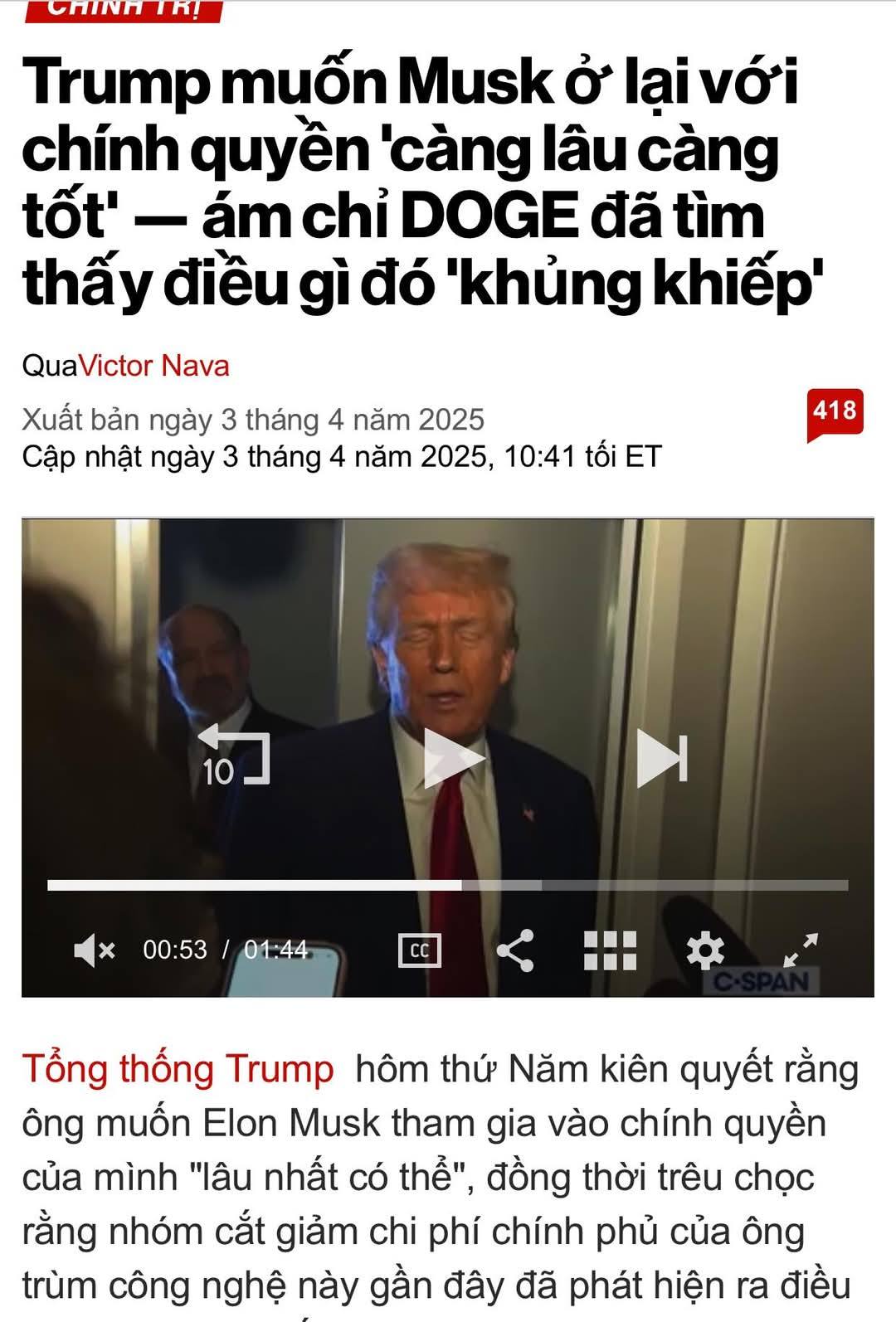 “[DOGE] đã tìm thấy một thứ gì đó khủng khiếp ngày hôm nay. Thật khủng khiếp bạn sẽ sớm biết thôi, Trump trêu chọc. “Những gì họ tìm thấy thật đáng kinh ngạc, và chúng tôi dành cho [Musk] rất nhiều tín nhiệm. Ông ấy có một số người rất thông minh.”