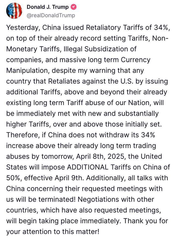 Hôm qua, Trung Quốc đã ban hành Thuế quan trả đũa 34%, ngoài Thuế quan đã lập kỷ lục, Thuế quan phi tiền tệ, Trợ cấp bất hợp pháp cho các công ty và Thao túng tiền tệ dài hạn, bất chấp cảnh báo của tôi rằng bất kỳ quốc gia nào Trả đũa Hoa Kỳ bằng cách ban hành Thuế quan bổ sung, ngoài việc lạm dụng Thuế quan dài hạn hiện có của họ đối với Quốc gia chúng ta, sẽ ngay lập tức phải chịu Thuế quan mới và cao hơn đáng kể, ngoài những Thuế quan đã đặt ra ban đầu. Do đó, nếu Trung Quốc không rút lại mức tăng 34% so với các hành vi lạm dụng thương mại dài hạn của họ vào ngày mai, ngày 8 tháng 4 năm 2025, Hoa Kỳ sẽ áp dụng Thuế quan BỔ SUNG đối với Trung Quốc là 50%, có hiệu lực từ ngày 9 tháng 4. Ngoài ra, mọi cuộc đàm phán với Trung Quốc liên quan đến các cuộc họp mà họ yêu cầu với chúng tôi sẽ bị chấm dứt! Các cuộc đàm phán với các quốc gia khác, những quốc gia cũng đã yêu cầu họp, sẽ bắt đầu diễn ra ngay lập tức. Cảm ơn các bạn đã quan tâm đến vấn đề này!