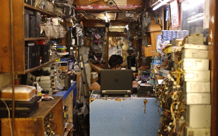 Trong một nơi sửa chữa nhỏ hẹp, thiếu ánh sáng tại chợ Nehru Place ở New Delhi, tiếng khoan nghe chạy rít lên và âm thanh của máy hàn vang vọng giữa không khí thật oi bức. Sushil Prasad, một kỹ thuật viên 35 tuổi, đang lau mồ hôi trên trán khi cẩn thận cho ghép lại