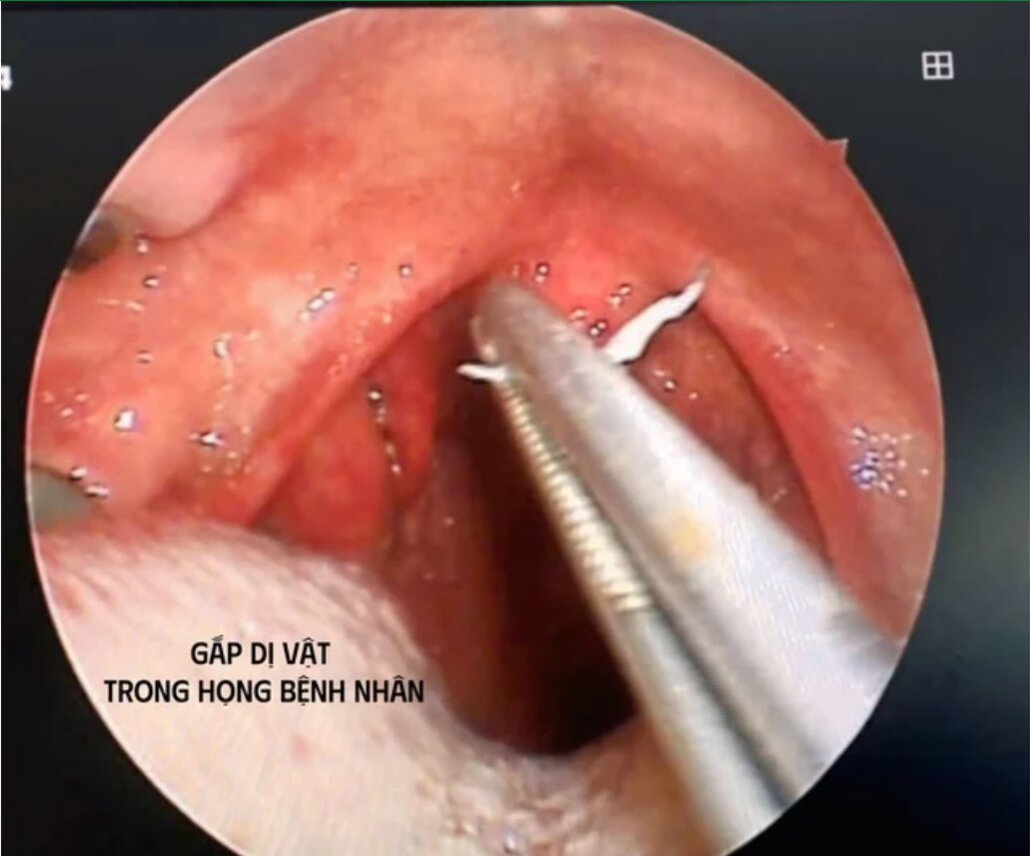 Trước đó, cụ đã dùng nhiều loại thuốc ho nhưng không đỡ, khiến cơ thể mệt mỏi, ăn uống kém và mất ngủ. Khi nội soi, bác sĩ phát hiện một dị vật kim loại nhỏ, sắc, cong như sợi dây nằm sâu trong khe amidan trái – vị trí khó quan sát bằng mắt thường.