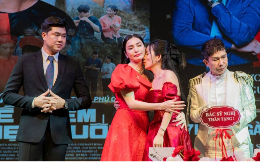 Long Nhật bật khóc (ngoài cùng, bên phải) trong buổi ra mắt phim ca nhạc của Dương Minh Thu (Ảnh: Ban tổ chức).