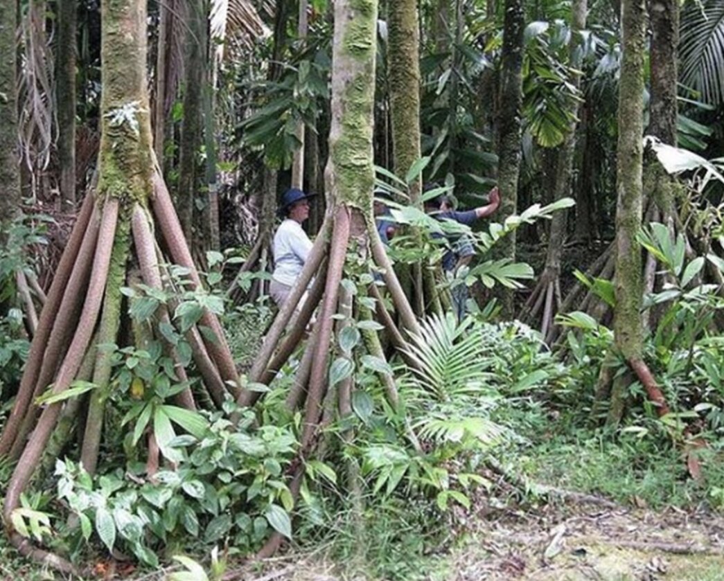 Bộ rễ của cây Socratea exorrhiza phát triển mạnh mẽ và nhiều rễ đâm ra từ gốc cây cách mặt đất vài feet.
