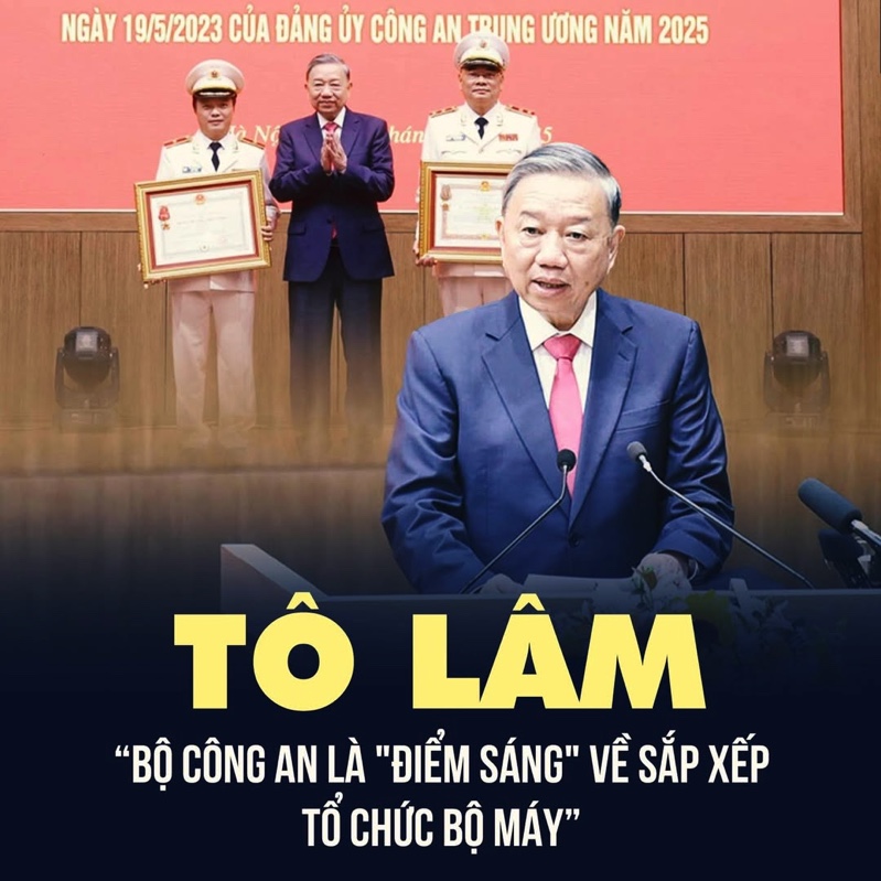 Phát biểu trong hội nghị tổng kết 10 năm thực hiện chỉ thị số 05 do bộ công an tổ chức vào chiều 19/5, Tô Lâm đánh giá "Bộ Công an là điểm sáng, mô hình điểm để cả hệ thống chính trị học tập về sắp xếp tổ chức bộ máy tinh, gọn, mạnh, hiệu năng, hiệu lực, hiệu quả".