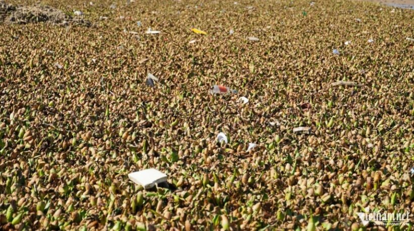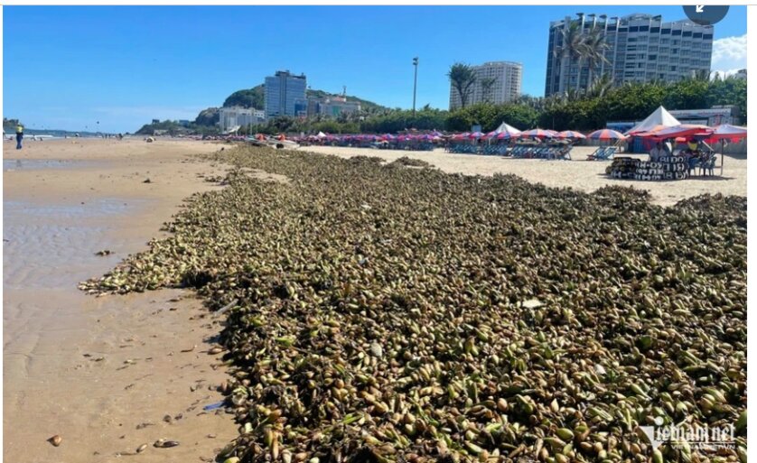Lục bình kèm với chai nhựa, mút xốp... theo từng đợt sóng dạt vào Bãi Sau Vũng Tàu (tỉnh Bà Rịa - Vũng Tàu) tạo thành lớp dày đặc, bủa vây trên bờ biển.