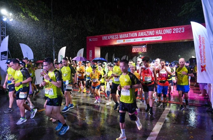 Người tham gia cự ly 10km xuất phát trong cơn mưa lớn tại VM Hạ Long 2023. Ảnh: VnExpress Marathon