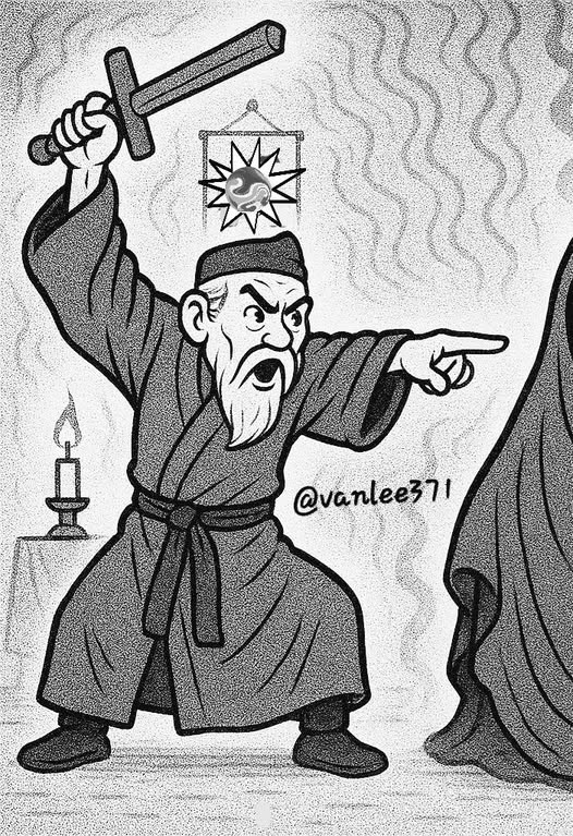 Đạo sĩ nghe xong... rút kiếm gỗ đào ra múa một hồi..., sau đó chỉ thẳng vào người phụ nữ và quát lớn: