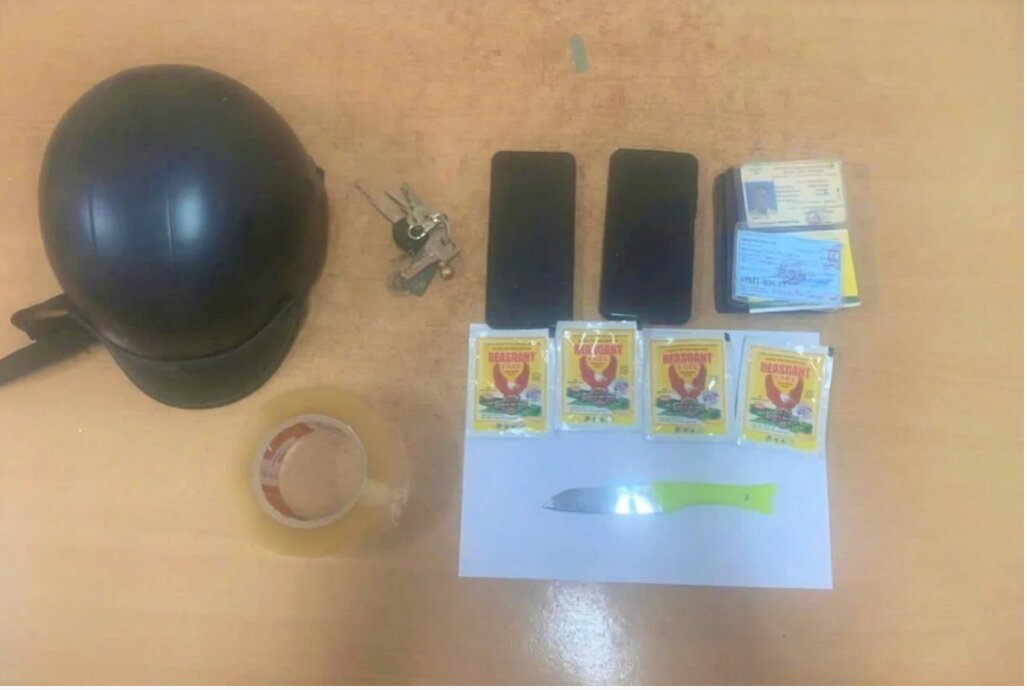 Công an thu giữ tang vật là 1 con dao, 4 gói thuốc trừ sâu; 3 điện thoại di động; 1 xe mô tô và các vật chứng có liên quan. Nguyễn Khắc Nhật là đối tượng đã từng có 2 tiền án và vừa ra tù về tội trộm cắp tài sản.
