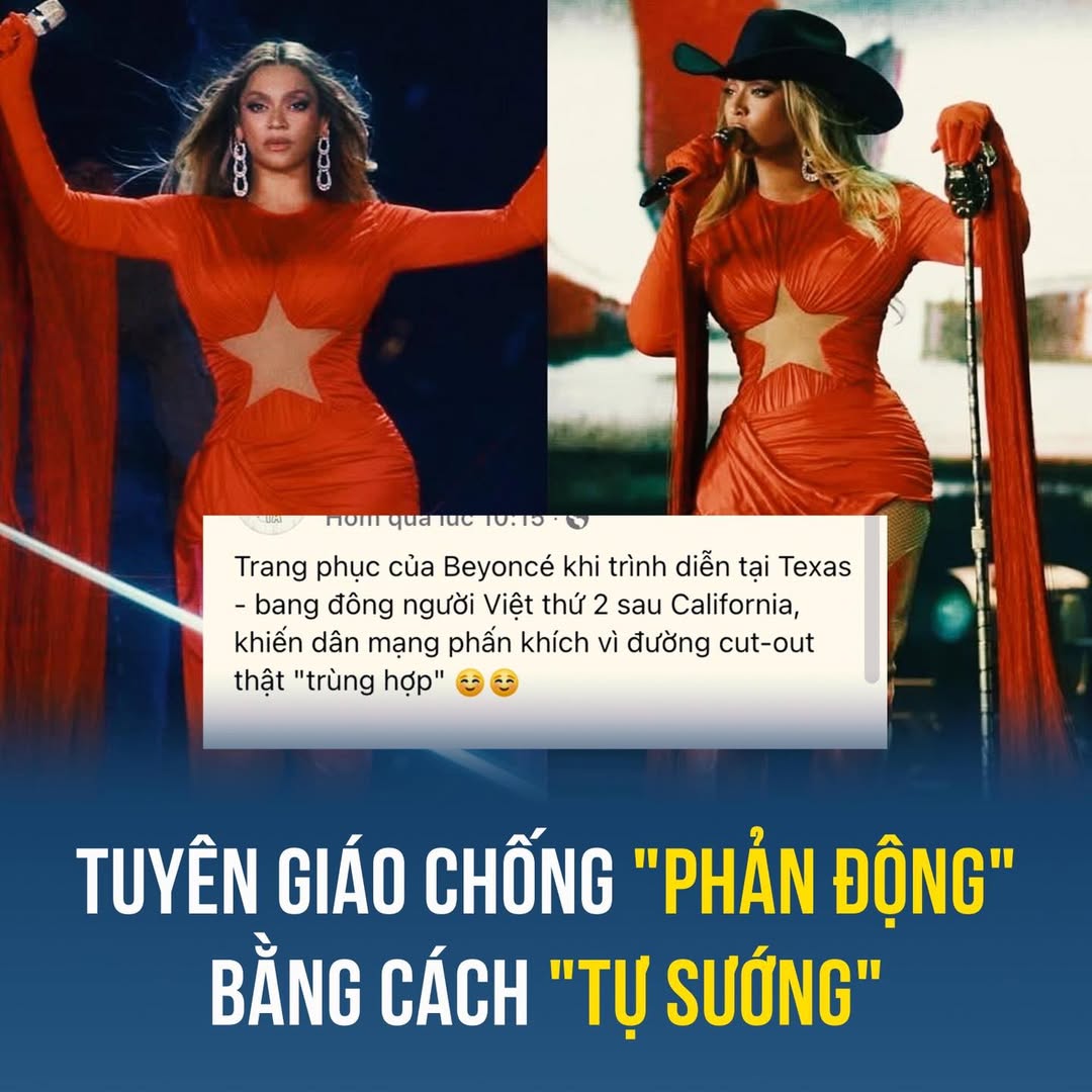 Mới đây, hình ảnh Beyoncé trình diễn tại Texas với bộ trang phục lấp lánh, màu đỏ, và đặc biệt có một đường cut-out hình ngôi sao ở giữa, đã khiến các chuyên gia định hướng dư luận của ban tuyên giáo sướng rên người, thở phào nhẹ nhõm để có cái chống "phản động" sau nhiều tuần chỉ toàn scandal cán bộ nhận hối lộ, truy thu thuế người dân và đấu đá nội bộ.