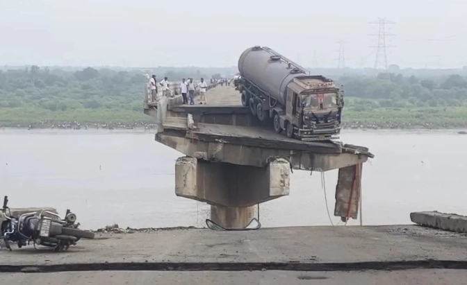 Một đoạn cây cầu Gambhira bắc qua sông Mahisagar, nối hai huyện Anand và Vadodara, đã bị sập vào giờ cao điểm giao thông sáng 9/7. Một trong số 23 nhịp của cây cầu dài gần 900 m đã sập xuống sông, kéo theo ít nhất 5 chiếc xe.