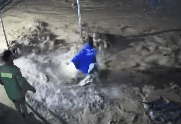 Rất may, nước lũ gặp nhiều vật cản trước nhà ông Ấn nên ông và người gặp nạn sau đó lồm cồm bò dậy rồi lên được hiên nhà thoát nạn. Toàn bộ sự việc này được camera ghi lại.