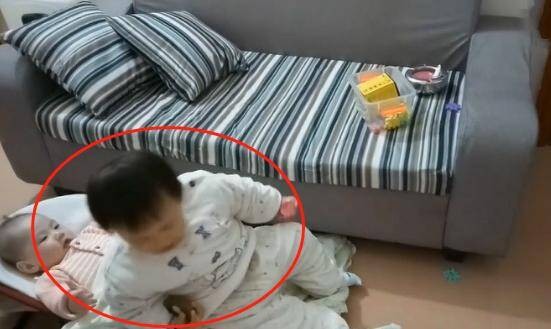 Cụ thể được biết, chuyện đã xảy ra khi mẹ của 2 nhóc tỳ vừa chỉ rời phòng khách ra trước nhà lấy hàng shipper. Mẹ vừa rời đi, chị gái đã nhanh chóng thực hiện loạt hành vi như lấy chân đạp, ngồi đè lên người em sơ sinh khi đứa trẻ đang nằm chơi trong nôi. Thậm chí, chị gái còn dùng một hộp nhựa úp vào mặt em.