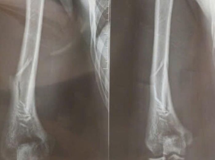 Hình ảnh chụp X-quang nam thanh niên 18 tuổi gãy tay khi chơi vật tay - Ảnh: BVCC