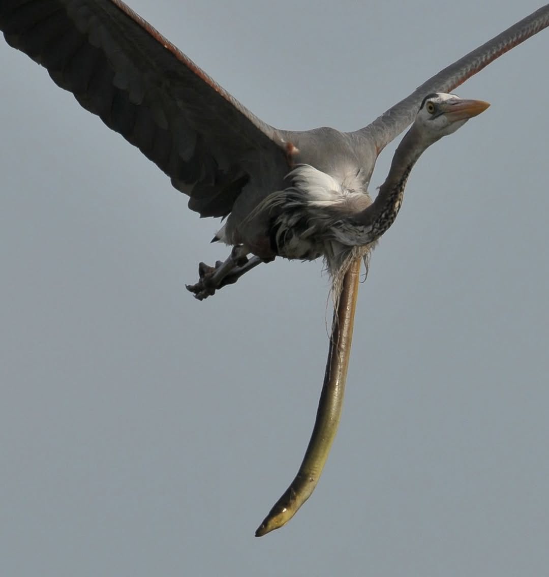 Con diệc đã nuốt chửng con lươn, nhưng chính con mồi ấy lại "phản đòn" một cách không tưởng: chui thẳng ra khỏi dạ dày chim, treo lủng lẳng giữa không trung!
