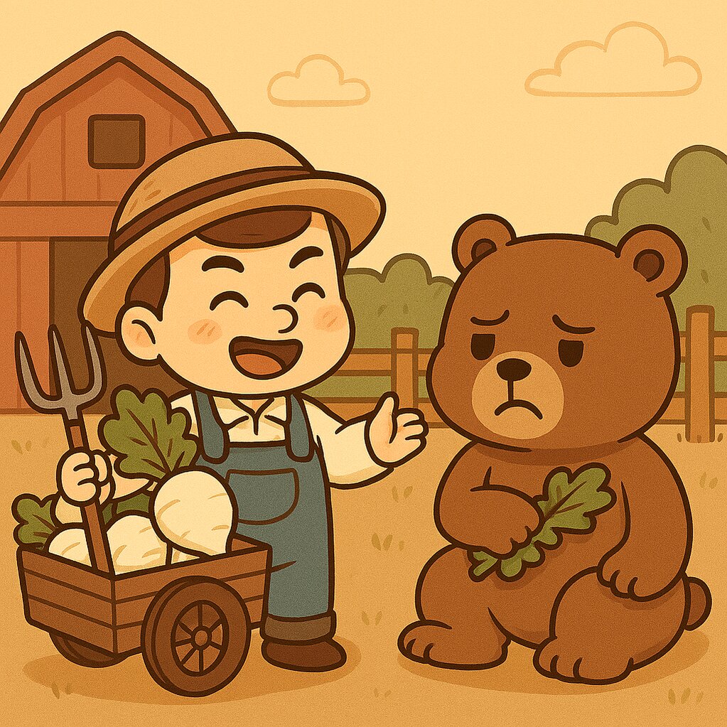 Bác nông dân trồng củ cải. Đến mùa thu hoạch, bác lấy phần gốc (củ), còn gấu nhận phần ngọn (lá). Gấu hí hửng ăn lá cải, nhưng đắng quá, nhè ra ngay. Gấu tức lắm, bị hớ một vố!