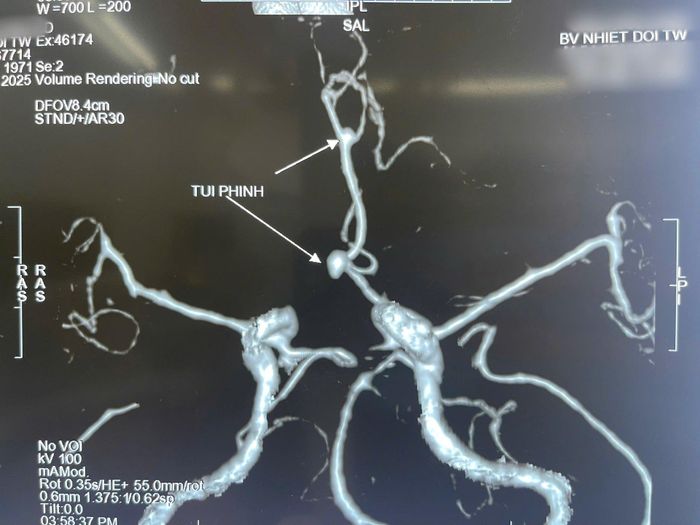 Chụp CT não khẩn cấp cho thấy bệnh nhân có xuất huyết dưới nhện lan tỏa hai bên - dấu hiệu điển hình của vỡ phình động mạch não. Kết quả chụp phim dựng hình mạch máu não xác định người bệnh có hai túi phình, trong đó túi phình động mạch thông trước đã vỡ, túi phình còn lại ở não trước kích thước nhỏ.