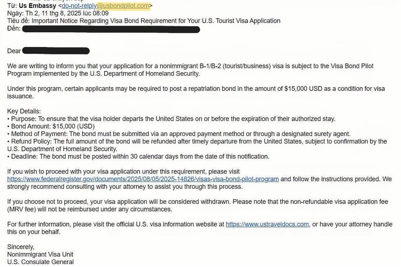 The United States has implemented a Visa Bond Pilot requiring citizens or nationals of certain countries to post a bond prior to traveling on a B visa. However, Vietnam is not currently among the pilot countries. Therefore, any emails claiming to be from the U.S. government asking Vietnamese B visa applicants to post a bond are likely fraudulent.
