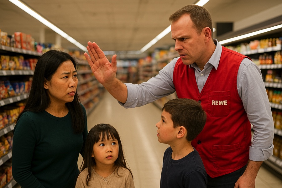Nhân viên Rewe được cho là đã lớn tiếng mắng mỏ, rồi đuổi theo hai chị em phụ nữ trong gia đình, ép họ ra lối cửa chính. Không dừng ở đó, anh ta còn tát mạnh vào mặt người chị gái – cú tát khiến nạn nhân ngã xuống và choáng váng.