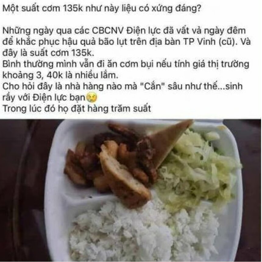 Chủ tài khoản Facebook đăng tải hình ảnh kèm nội dung: “Những ngày qua, các cán bộ, nhân viên điện lực đã vất vả ngày đêm khắc phục hậu quả bão lũ trên địa bàn TP Vinh (cũ). Và đây là suất cơm 135.000 đồng.