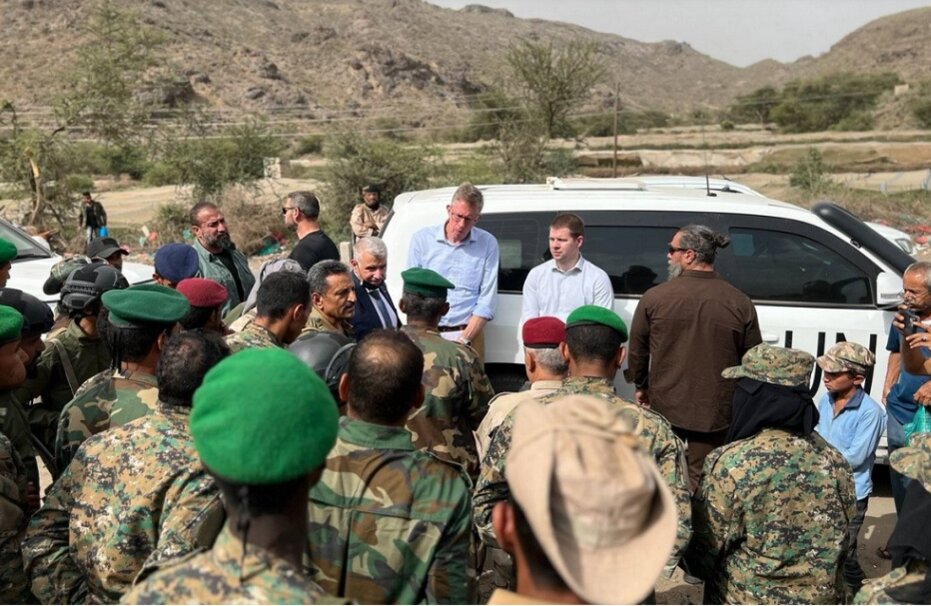 Phái đoàn Liên Hợp Quốc tới thăm một khu vực ở Yemen. Ảnh: OSE Yemen/Mạng xã hội X
