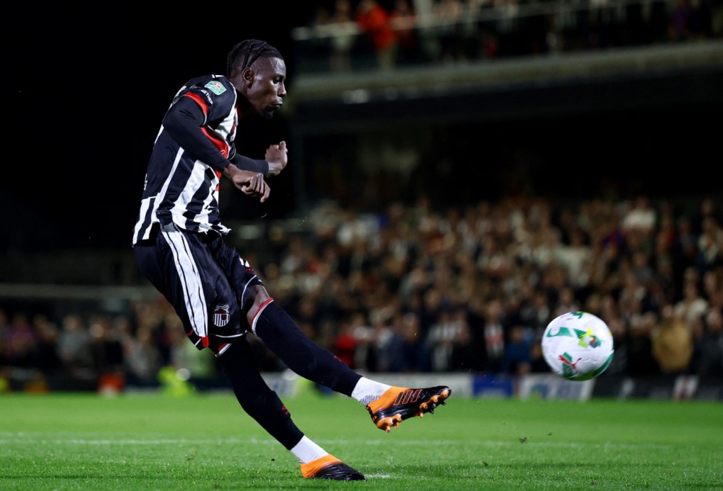Clarke Oduor đá hỏng trong loạt luân lưu, khi Grimsby Town thắng Man Utd ở vòng hai Cup Liên đoàn trên sân Blundell Park, thị trấn Cleethorpes, hạt Lincolnshire, Vương quốc Anh tối 27/8/2025. Ảnh: Reuters