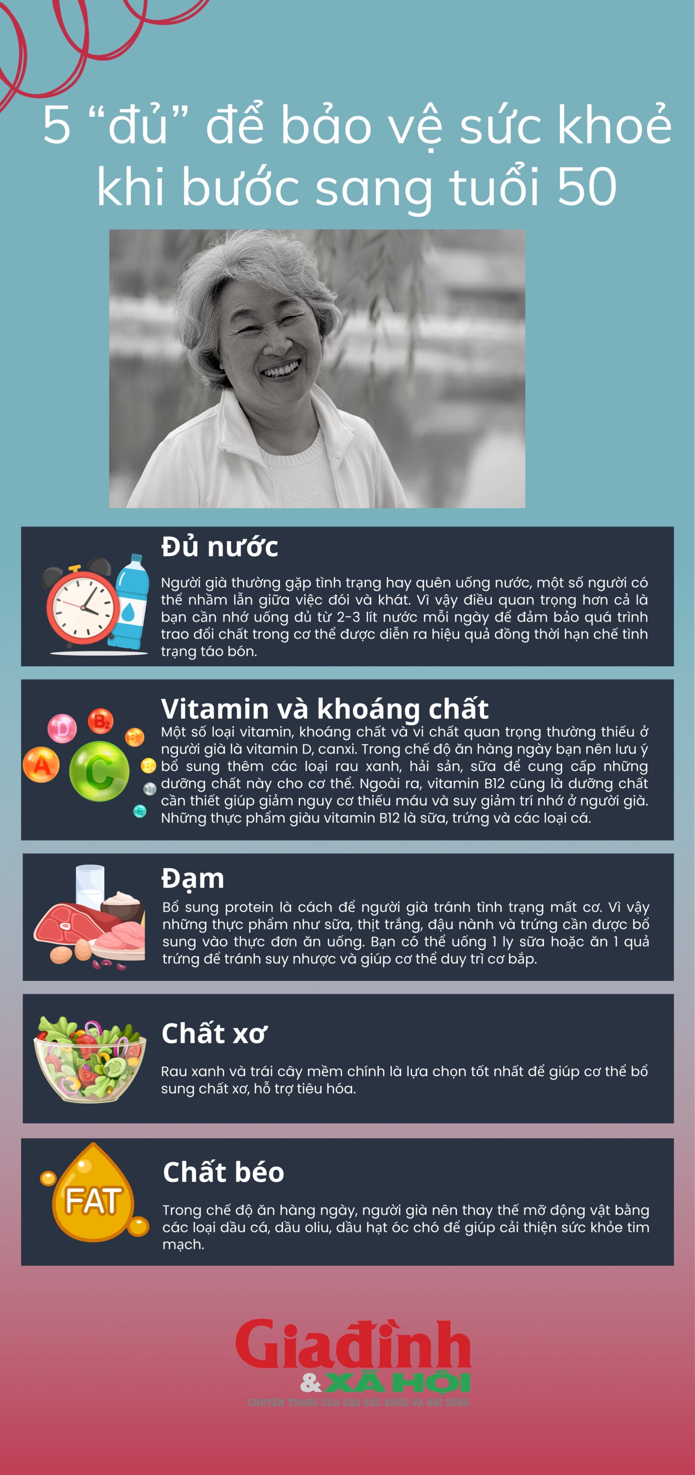 Infographic hướng dẫn 5 việc làm “đủ” giúp bảo vệ sức khỏe tuổi 50 - đây là bí quyết vàng giúp người trung niên sống khỏe, phòng ngừa bệnh tật và kéo dài tuổi thọ.