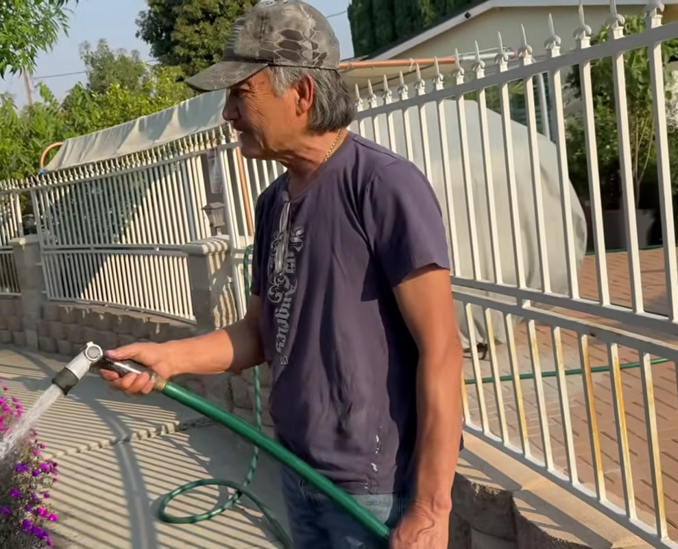 Mới đây, ca sĩ Quang Lê đã tới nhà danh ca Hương Lan chơi. Vừa tới cửa nhà, Quang Lê đã thấy ông xã Hương Lan đang tưới cây trong vườn.