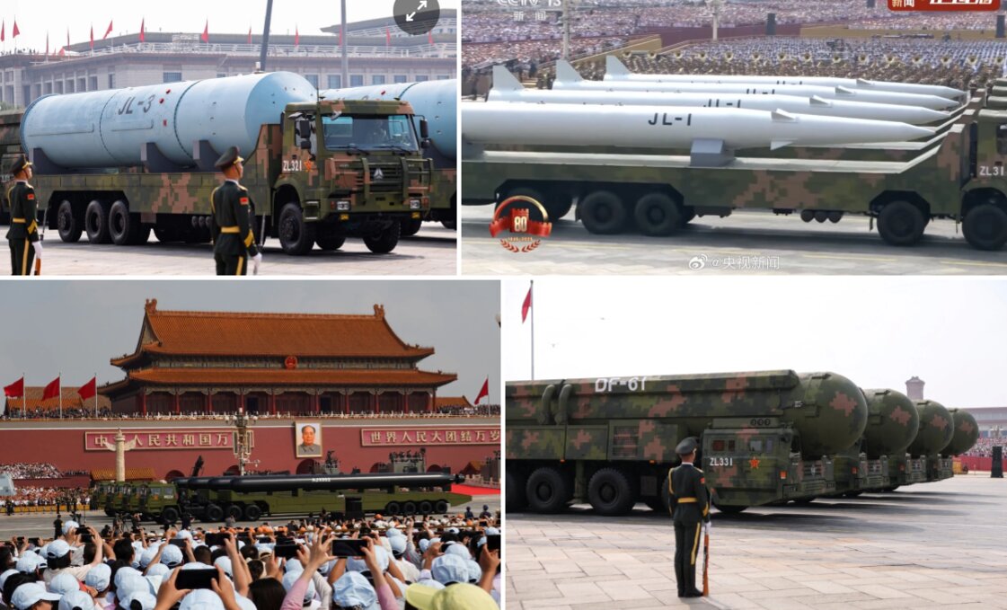 Tại lễ duyệt binh, Trung Quốc lần đầu tiên công khai trình diễn “bộ ba” khả năng răn đe hạt nhân có thể phóng từ biển, đất liền và trên không. Trong đó có tên lửa tầm xa trên không JL-1, tên lửa liên lục địa phóng từ tàu ngầm JL-3, cùng các tên lửa liên lục địa trên đất liền DF-61 và DF-31.