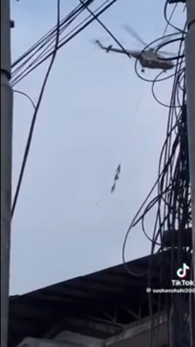 Hình ảnh lan truyền trên mạng xã hội được cho là bộ trưởng Nepal và gia đình bám dây trực thăng trốn người biểu tình.