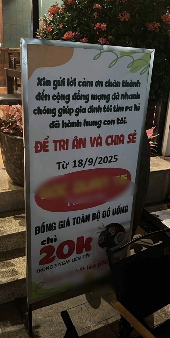 "Xin gửi lời cảm ơn chân thành đến cộng đồng mạng đã nhanh chóng giúp gia đình tôi tìm ra kẻ đã hành hung con tôi. Để tri ân và chia sẻ, từ ngày 18/9/2025, quán đồng giá toàn bộ đồ uống chỉ 20.000 đồng trong 3 ngày liên tiếp."