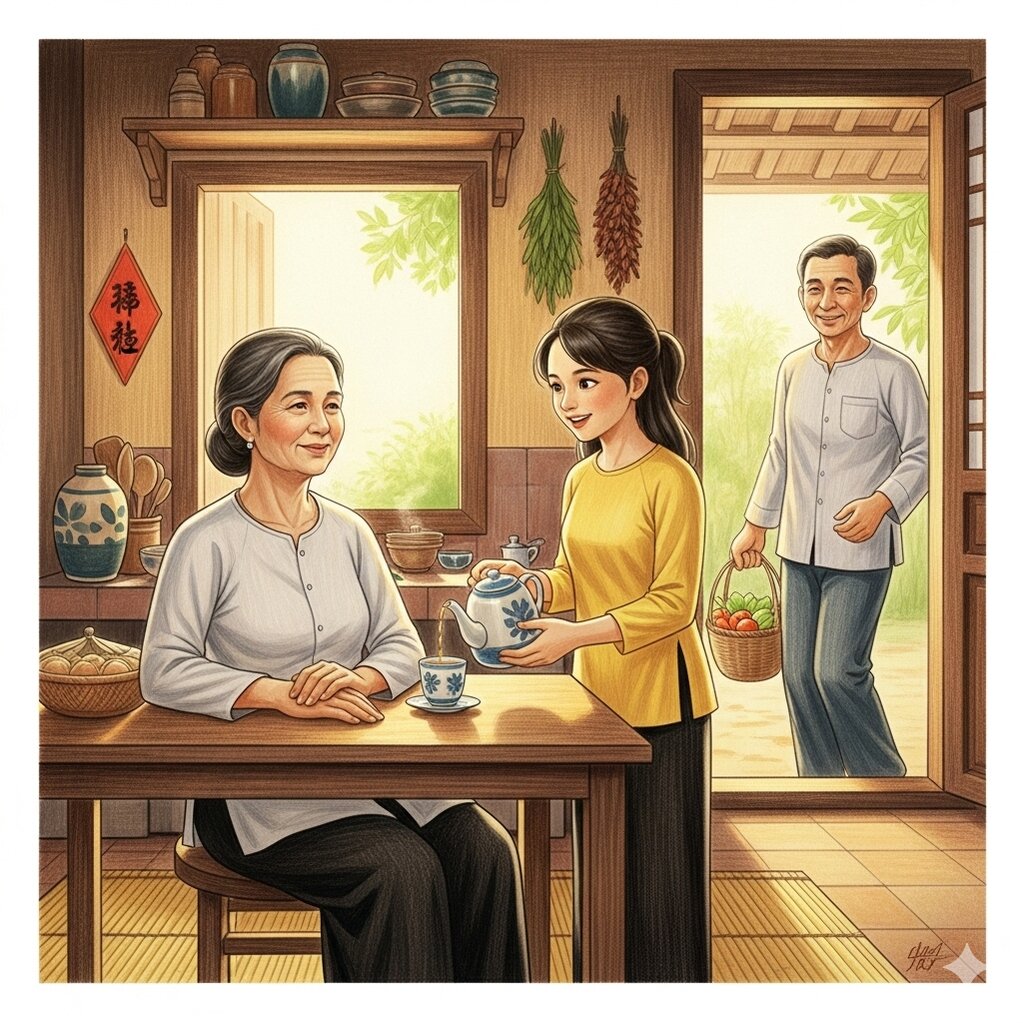 Ngày ấy, bà cũng từng run rẩy bước về nhà chồng, từng sợ hãi mỗi lời soi xét, từng khép nép trước từng bữa cơm. Nhưng rồi, bà tự nhủ: “Nếu đã là gia đình, thì hãy cố mà thương nhau”. Vậy nên, khi con trai lập gia đình, bà đã chọn cách sống khác.