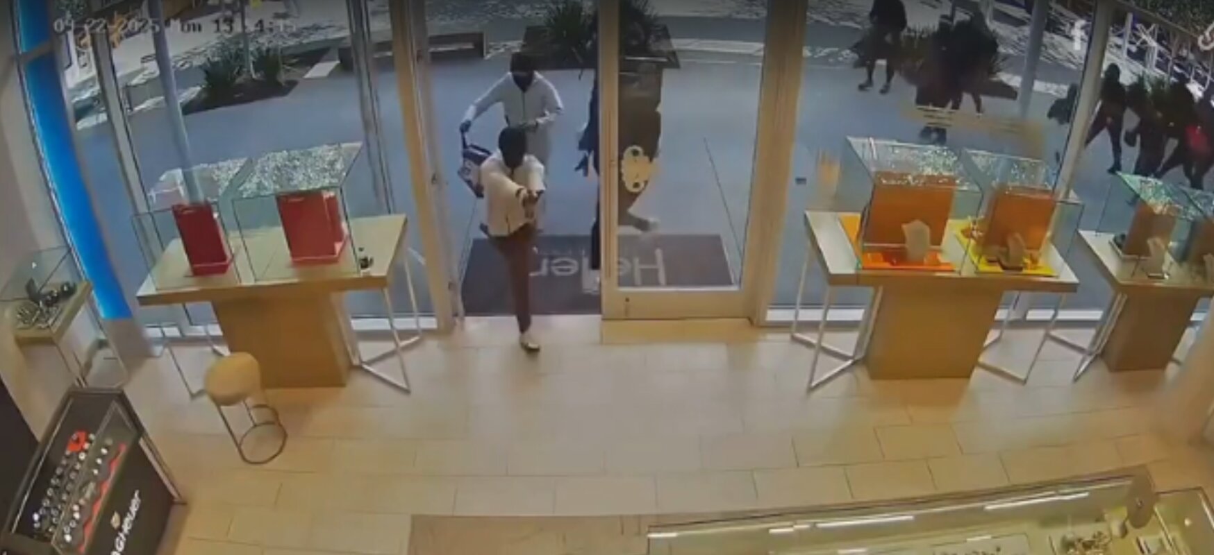 Trong vụ cướp, nhóm gần 25 nghi phạm bịt mặt mang búa, súng xông vào tiệm, đập phá tủ trưng bày để cướp trang sức. Khi bị khóa bên trong bằng cửa tự động, nhóm cướp nổ súng phá cửa rồi chạy lên 6 ôtô tẩu thoát.