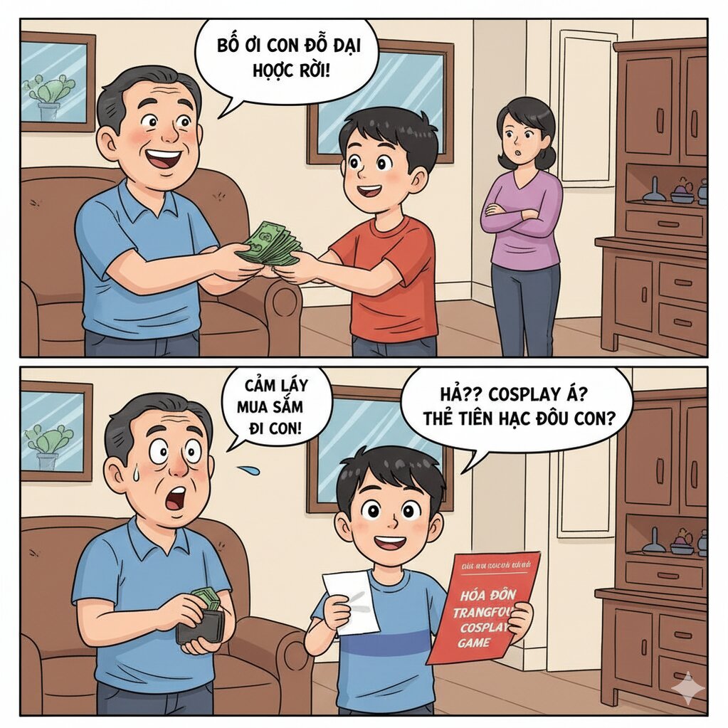 Ông đưa tiền cho con và dặn: