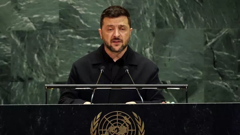 Ông Zelensky phát biểu tại Đại hội đồng Liên Hợp Quốc. Ảnh Getty