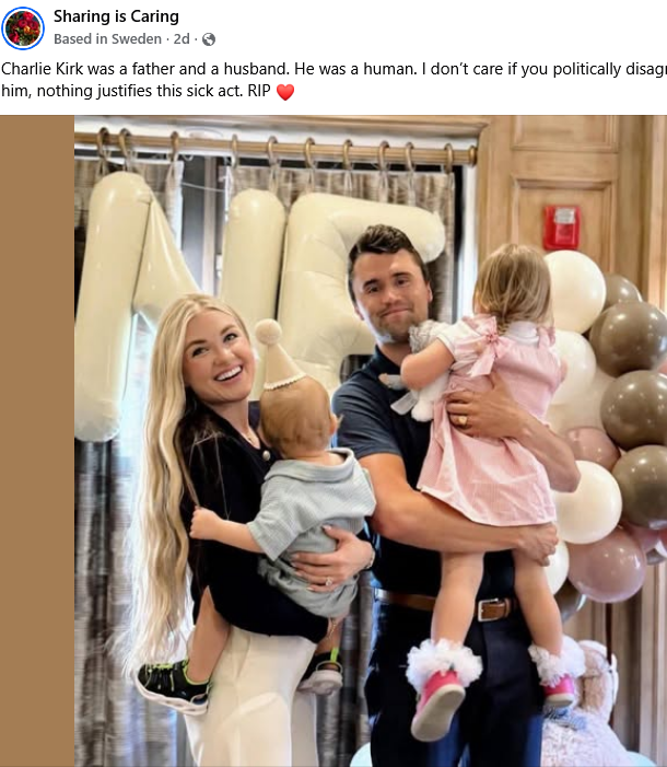 Ảnh vợ chồng và hai con của Charlie Kirk nhanh chóng lan truyền trên mạng xă hội cùng với những lời thương tiếc. Tôi lấy hai tin nhắn thí dụ sau đây :