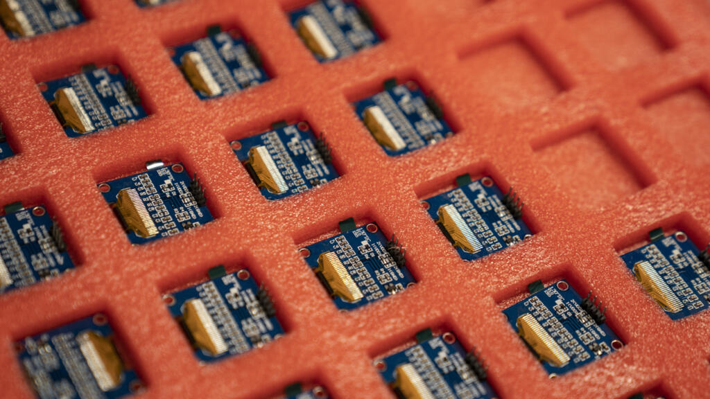 Ảnh minh họa : Chip bán dẫn được lắp ráp và sắp xếp trên bàn làm việc trước lễ cắt băng khánh thành trung tâm sản xuất Nanotronics tại Xưởng Hải quân Brooklyn, New York, Mỹ, ngày 28/04/2021. AP - John Minchillo