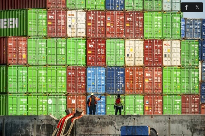 Công nhân cố định dây từ một tàu container tại cảng Oakland, California, Mỹ, ngày 4/4. Ảnh: AP
