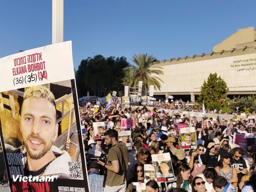Không khí náo nhiệt tại Quảng trường Con tin ở Tel Aviv khi các con tin được trả tự do. (Ảnh: Vietnam+)