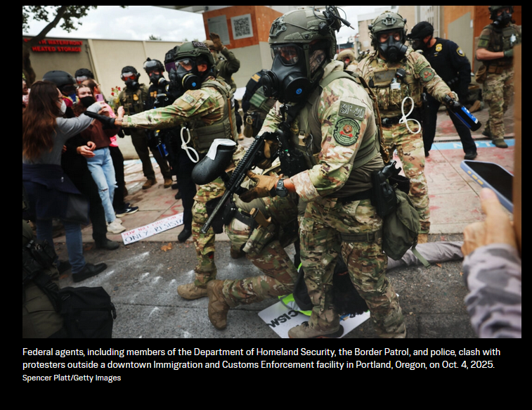 Federal agents, including members of the Department of Homeland Security, the Border Patrol, and police, clash with protesters outside a downtown Immigration and Customs Enforcement facility in Portland, Oregon, on Oct. 4, 2025. Spencer Platt/Getty Images