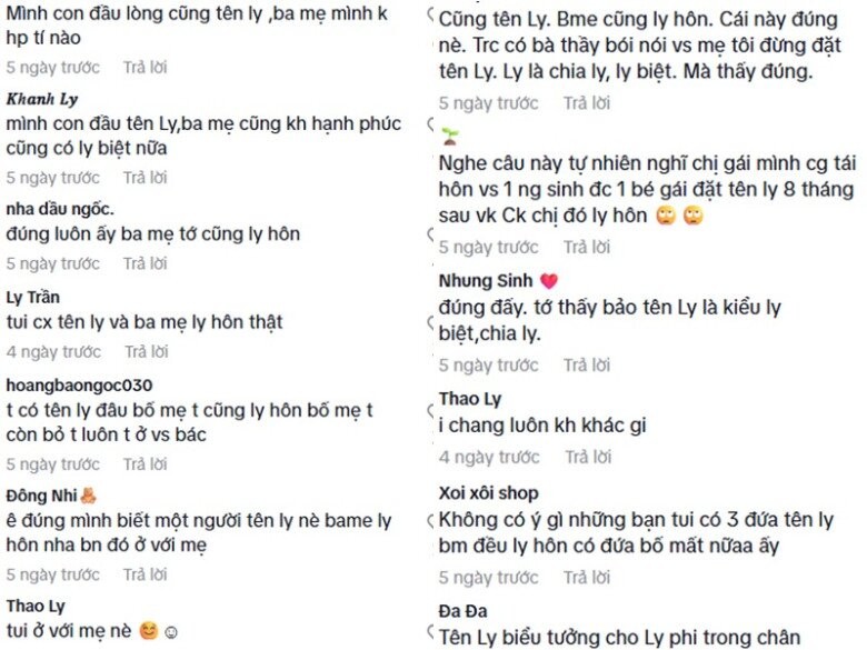 Song cũng có nhiều người cho rằng chuyện ly hôn, ly biệt trong gia đình hoàn toàn không phải do cái tên gây nên và cách nói như vậy thật sự vô cùng chủ quan, phiến diện. Bởi rất nhiều người tên Ly, con cái tên Ly nhưng có cuộc sống gia đình hạnh phúc ấm êm.