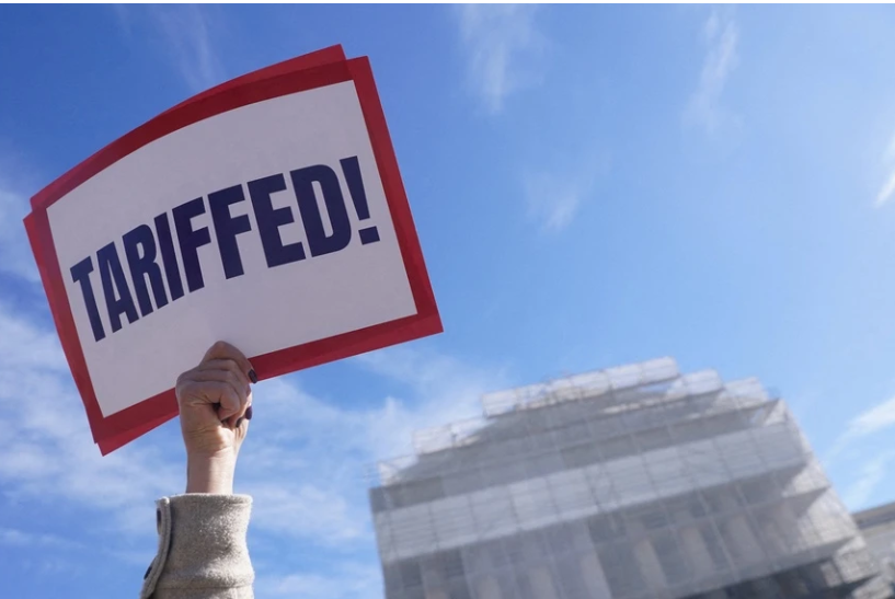 Một người dân giơ tấm bảng phản đối thuế quan bên ngoài Tòa án tối cao Mỹ ở Washington, D.C vào ngày 5/11, khi tòa án xét xử vụ kiện về tính hợp pháp của các mức thuế quan của ông Trump. Ảnh: Reuters.