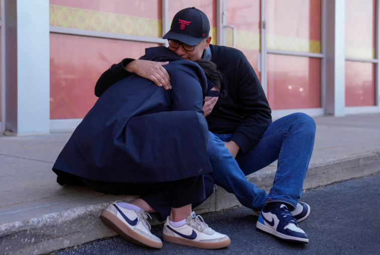 Phụ huynh an ủi nhau bên ngoài trường mầm non Rayito de Sol, ngày 5/11. Ảnh: AP